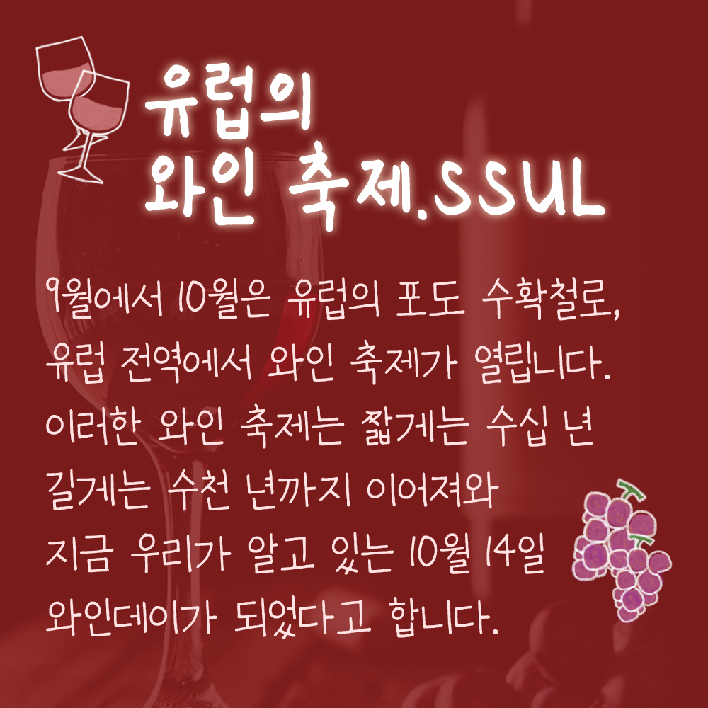 9월에서 10월은 유럽의 포도 수확철로, 유럽 전역에서 와인 축제가 열립니다. 이러한 와인 축제는 짧게는 수십 년 길게는 수천 년까지 이어져와 지금 우리가 알고 있는 10월 14일 와인데이가 되었다고 합니다.
