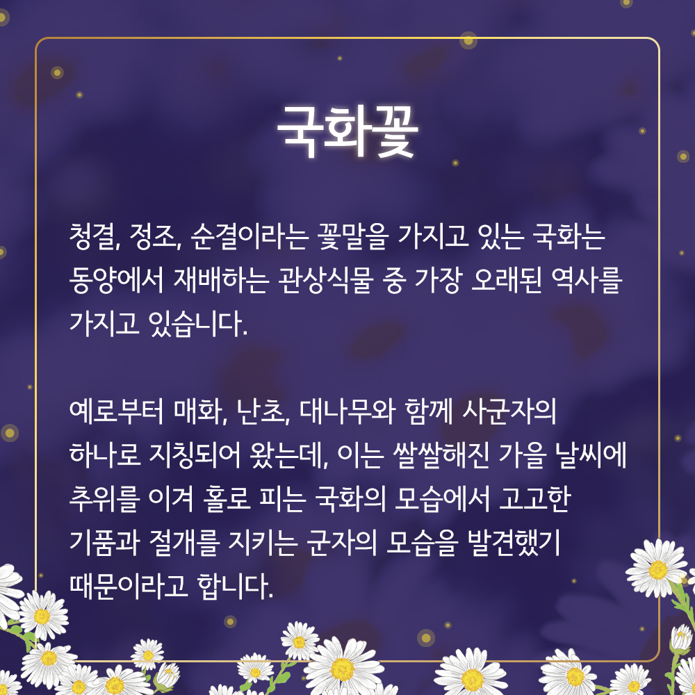 국화꽃은 청결, 정조, 순결이라는 꽃말을 가지고 있는 만큼 아주 오래전부터 매화, 난초, 대나무와 함께 사군자의 하나로 지칭되어왔습니다.