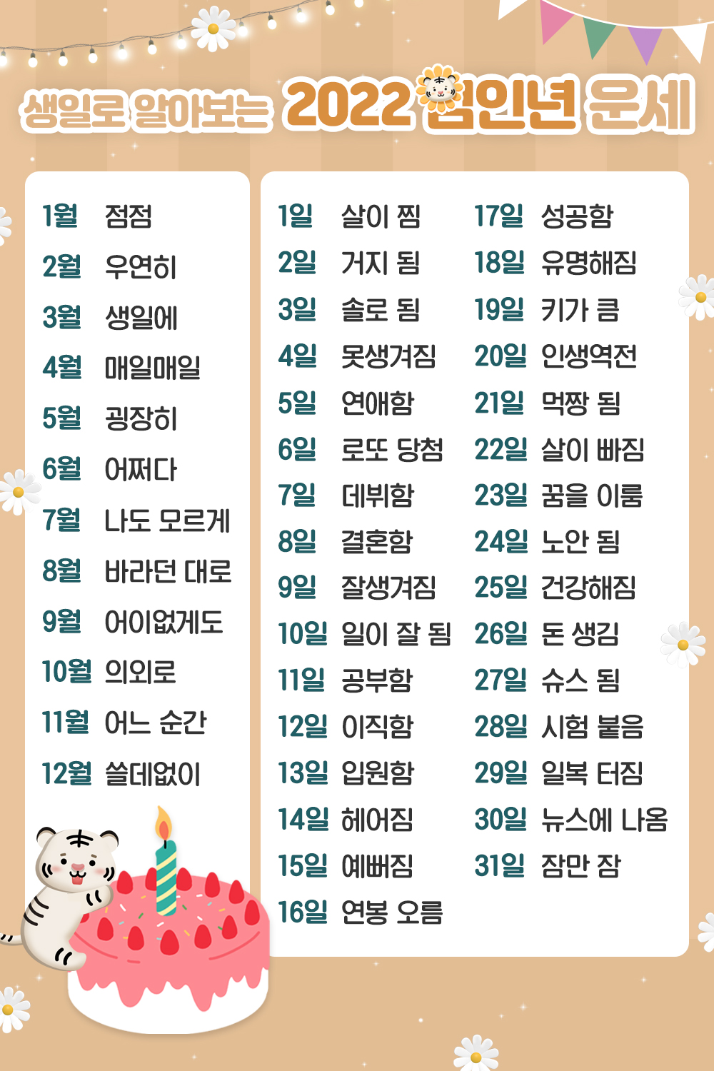 | 10일 | 일이 잘 됨 | 26일 | 돈 생김 |