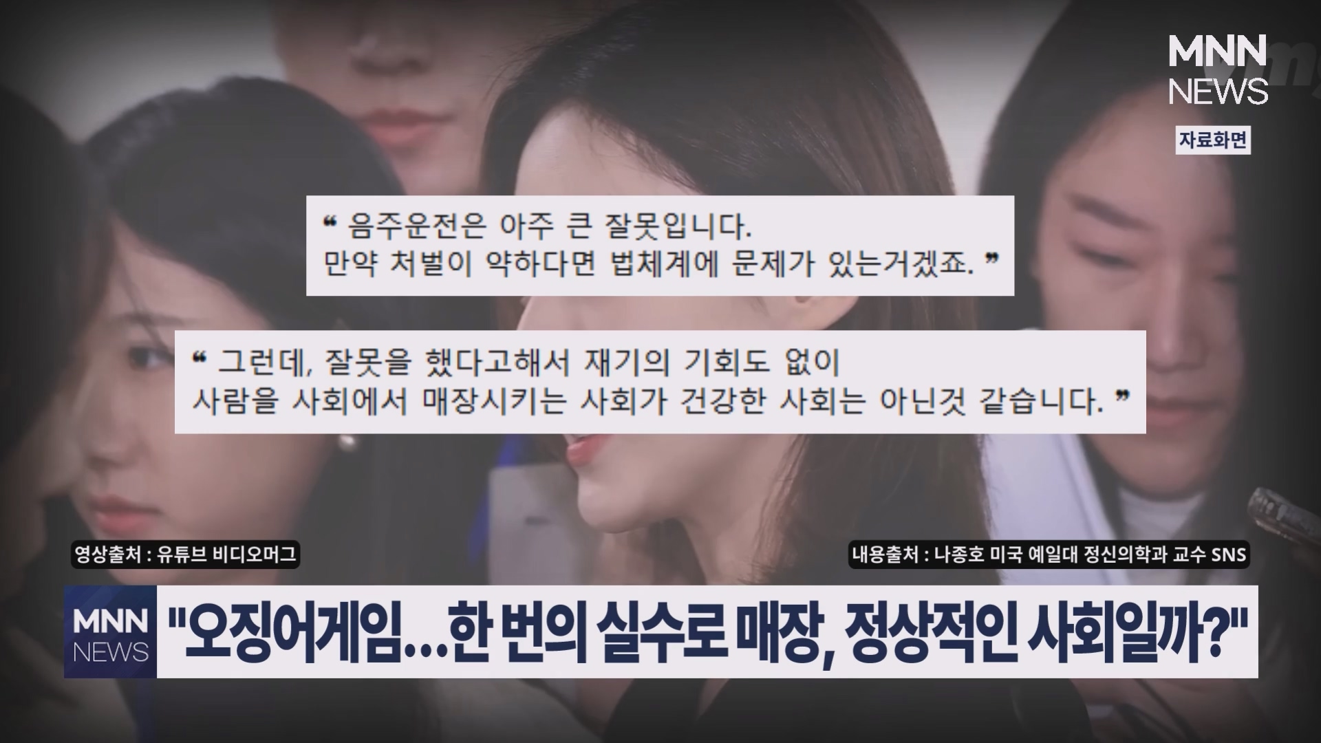 예일대 정신의학과 나종호 교수는 김새론의 죽음을 두고, 우리 사회가 마치 '거대한 오징어게임' 같다고 지적했습니다.그는 음주운전이 분명한 잘못임을 인정하면서도, 한 번의 실수로 사회에서 매장되는 현실이 과연 정상적인 사회인지 의문을 던졌습니다.