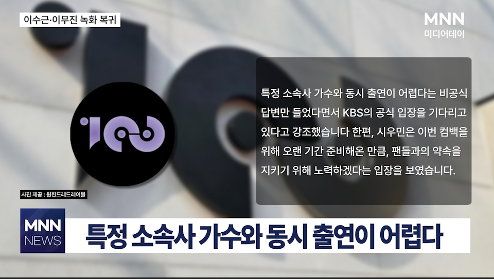 원헌드레드는 우리는 '특정 소속사 가수와 동시 출연이 어렵다'는 비공식 답변만 들었다면서,"KBS의 공식 입장을 기다리고 있다고 강조했습니다. 한편, 시우민은 이번 컴백을 위해 오랜 기간 준비해온 만큼, 팬들과의 약속을 지키기 위해 노력하겠다는 입장을 보였습니다.